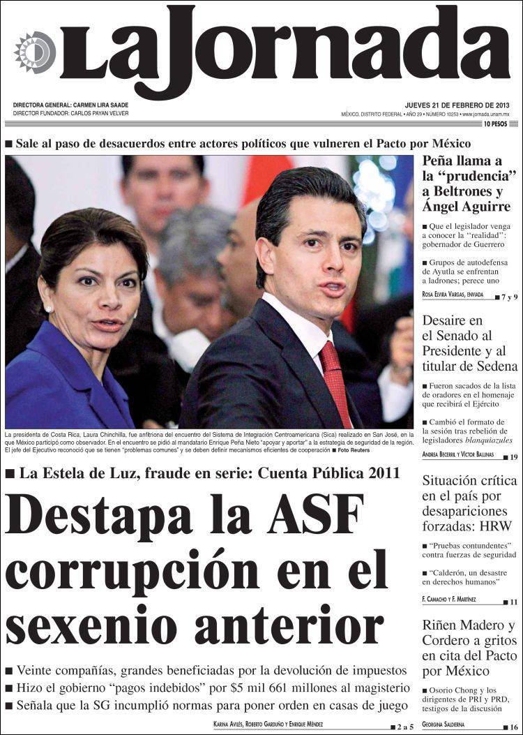 Primeras Planas de este jueves 21 de febrero del 2013