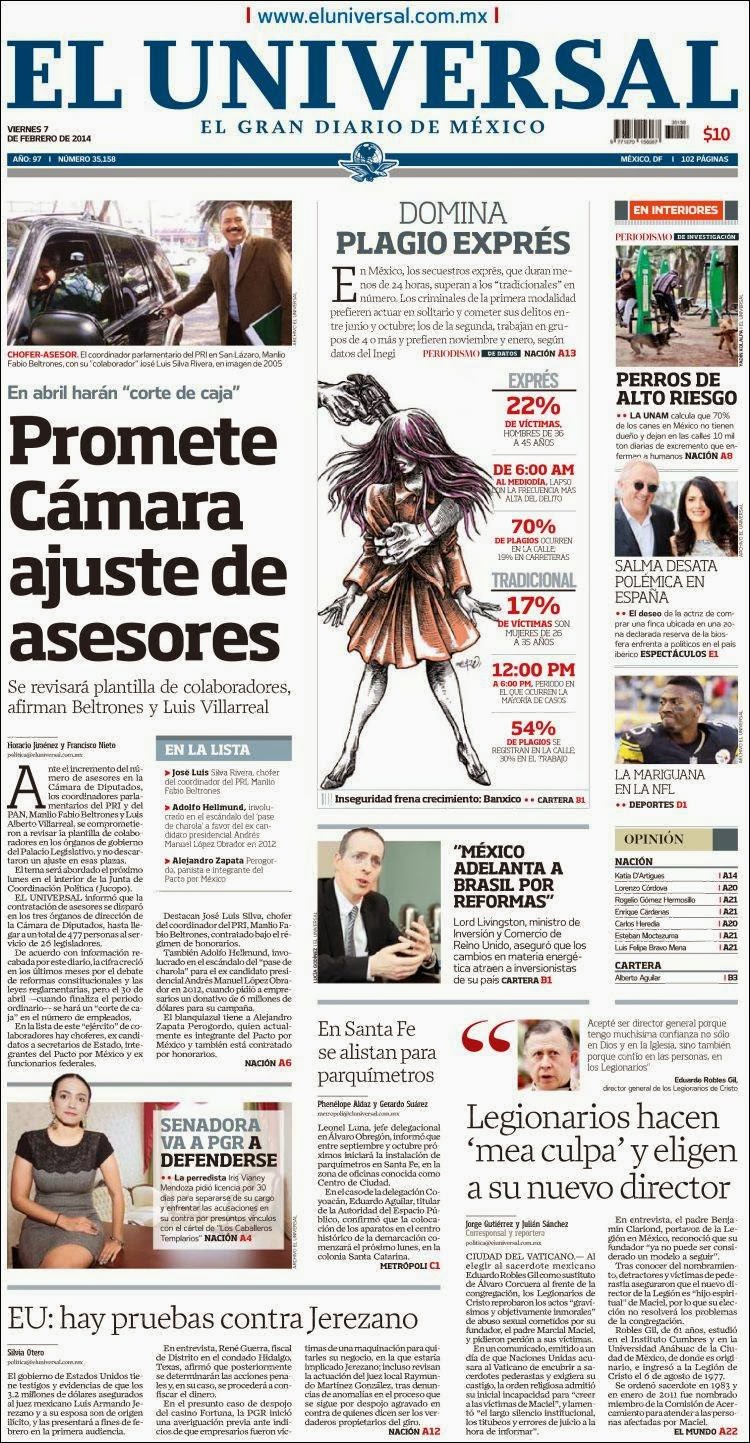 Primeras Planas de este viernes 7 de febrero del 2014